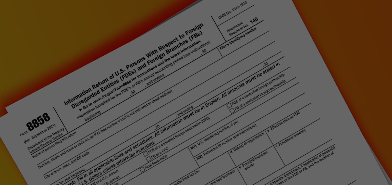 Form 8858 is the Information Return of U.S. Persons with Respect to Foreign Disregarded Entities. This means that anyone who has business assets outside of the U.S. but is a U.S. citizen or using a Green Card, will need to file this form to declare their business finances alongside their Federal Tax Return.